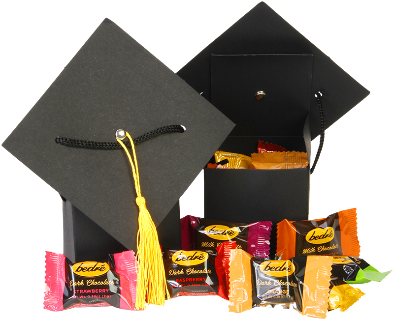 Congratulations are always best said with Bedré Meltaways!  Our cardboard graduation caps with yellow tassel comes filled with 10 various flavored melts!